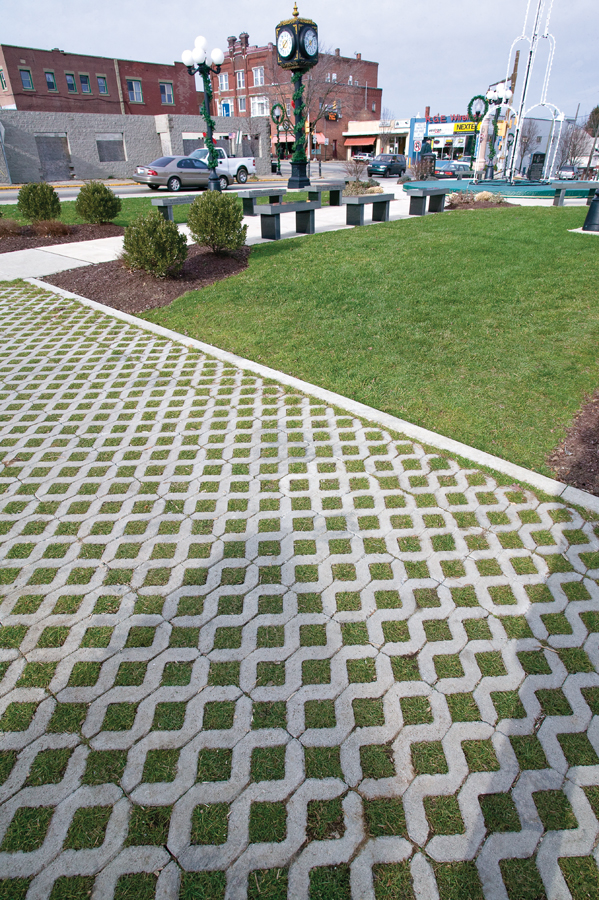 The exceptionally sturdy Turfstone interlocking concrete paver allows grass to grow up through the diamond cutouts while preventing soil run off and offering the support necessary to maintain a level, beautiful surface.